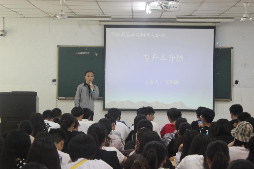 为帮助2018级学生了解更多专升本信息,做好未来的学习规划,经济贸易学院于5月9日下午2点半在W103教室举办了专升本专题讲座。此次讲座由必赢官网经济学教研室主任周振鹏老师主讲,18级国贸一班、国贸二班、国贸跨境的全体专科同学参加了讲座。